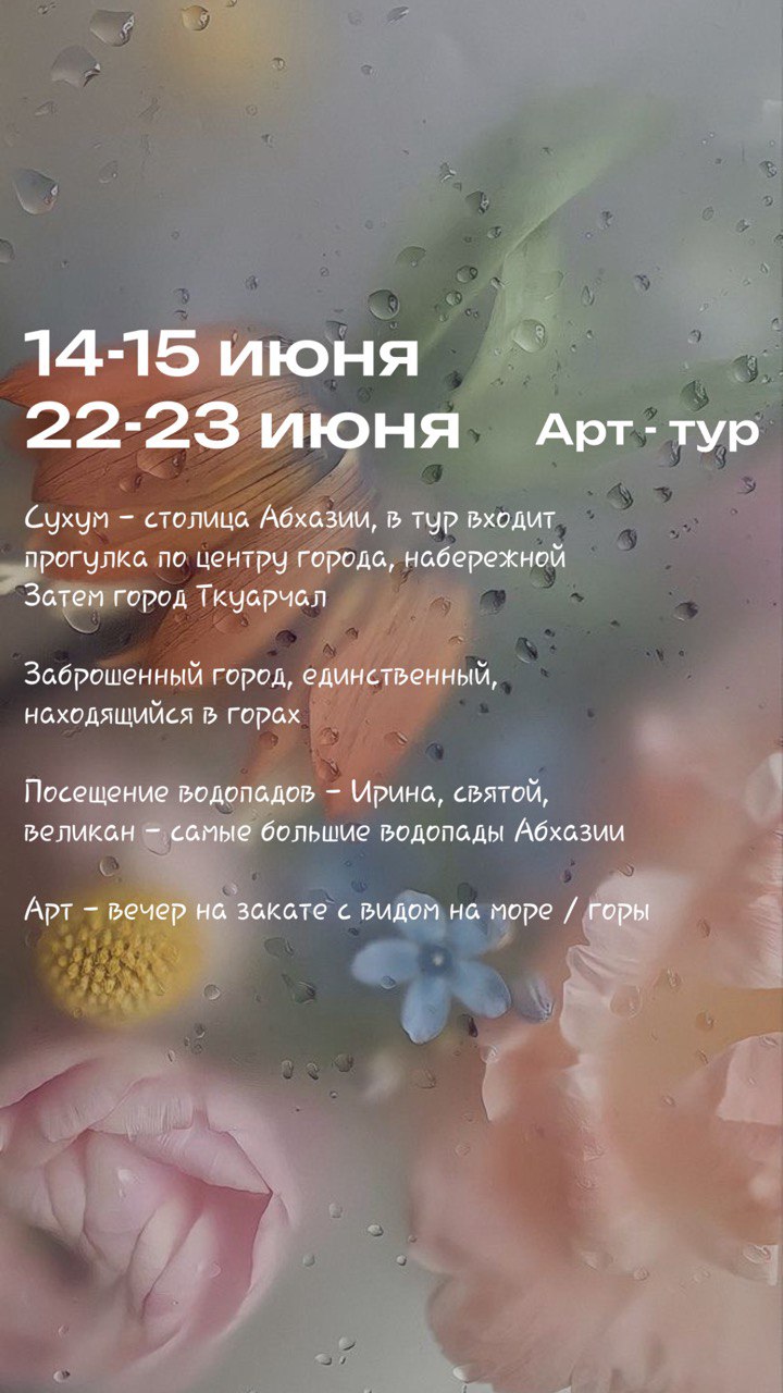 Сухум - столица Абхазии , в тур входит прогулка по центру города, набережной Затем город Ткуарчал Заброшенный город, единственный город, который в горах Посещение водопадов - Ирина, святой, великан - самые большие водопады Абхазии! Арт вечер на закате с видом на море или на горы